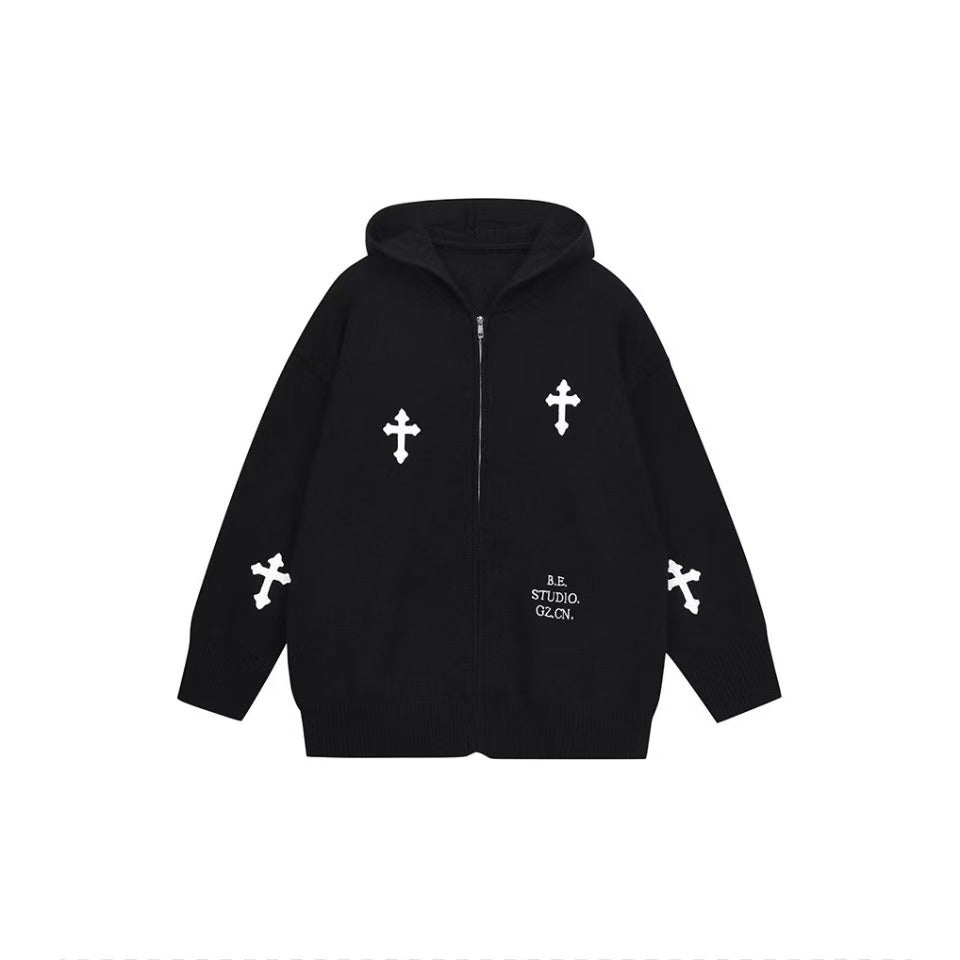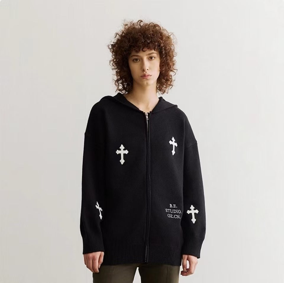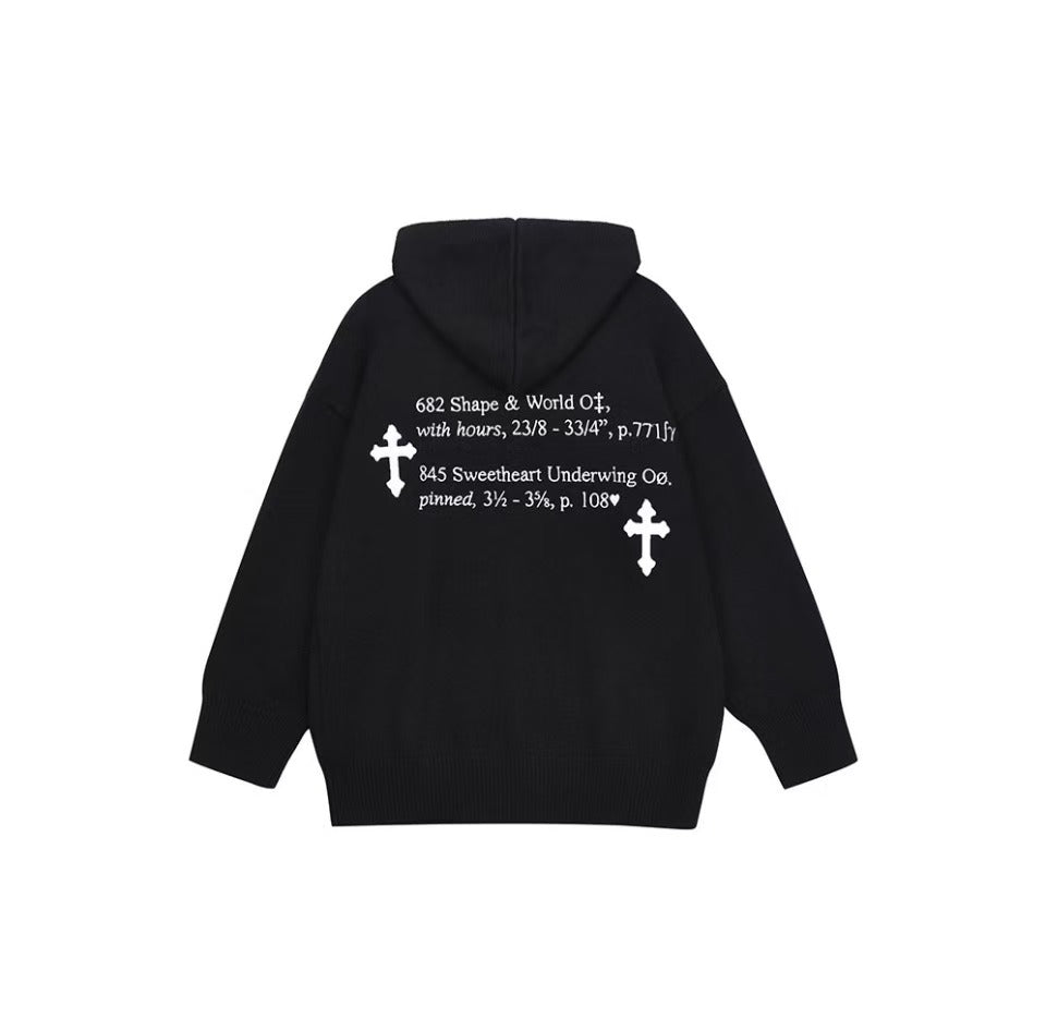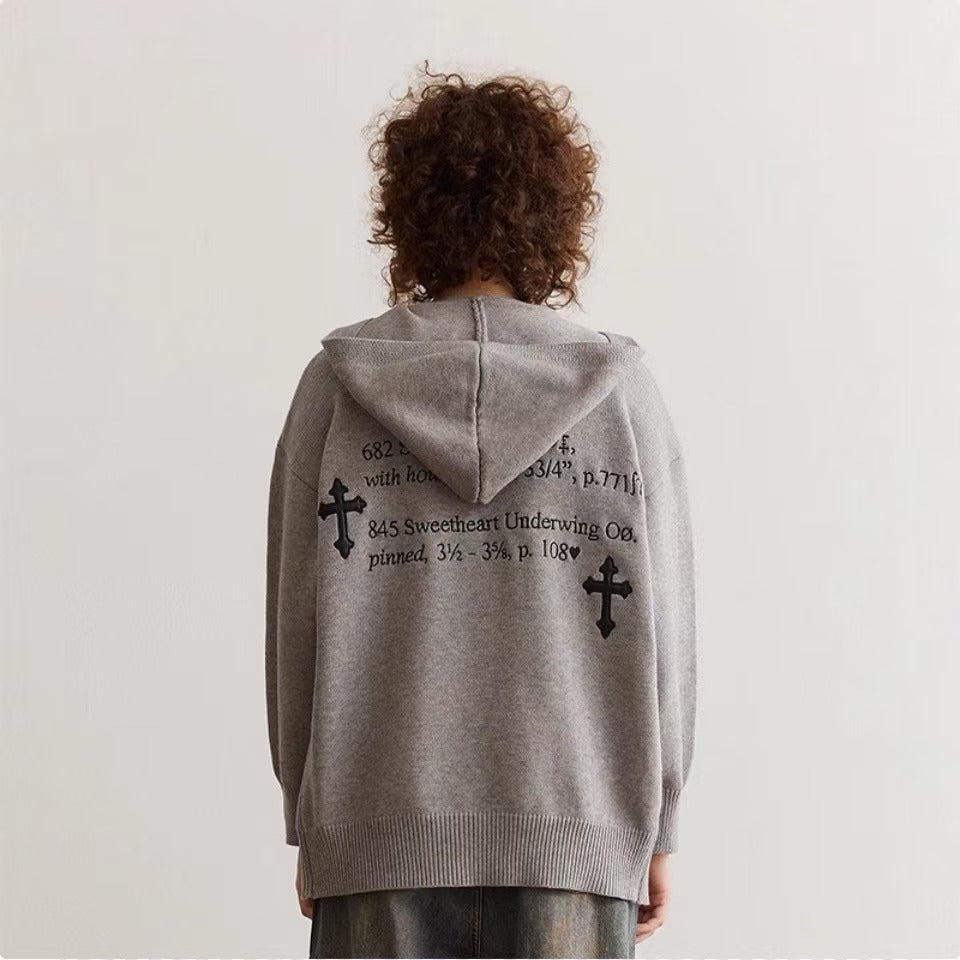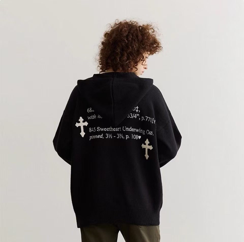 Leather embroidery zipper hooded loose long-sleeved knit Men's and women's models