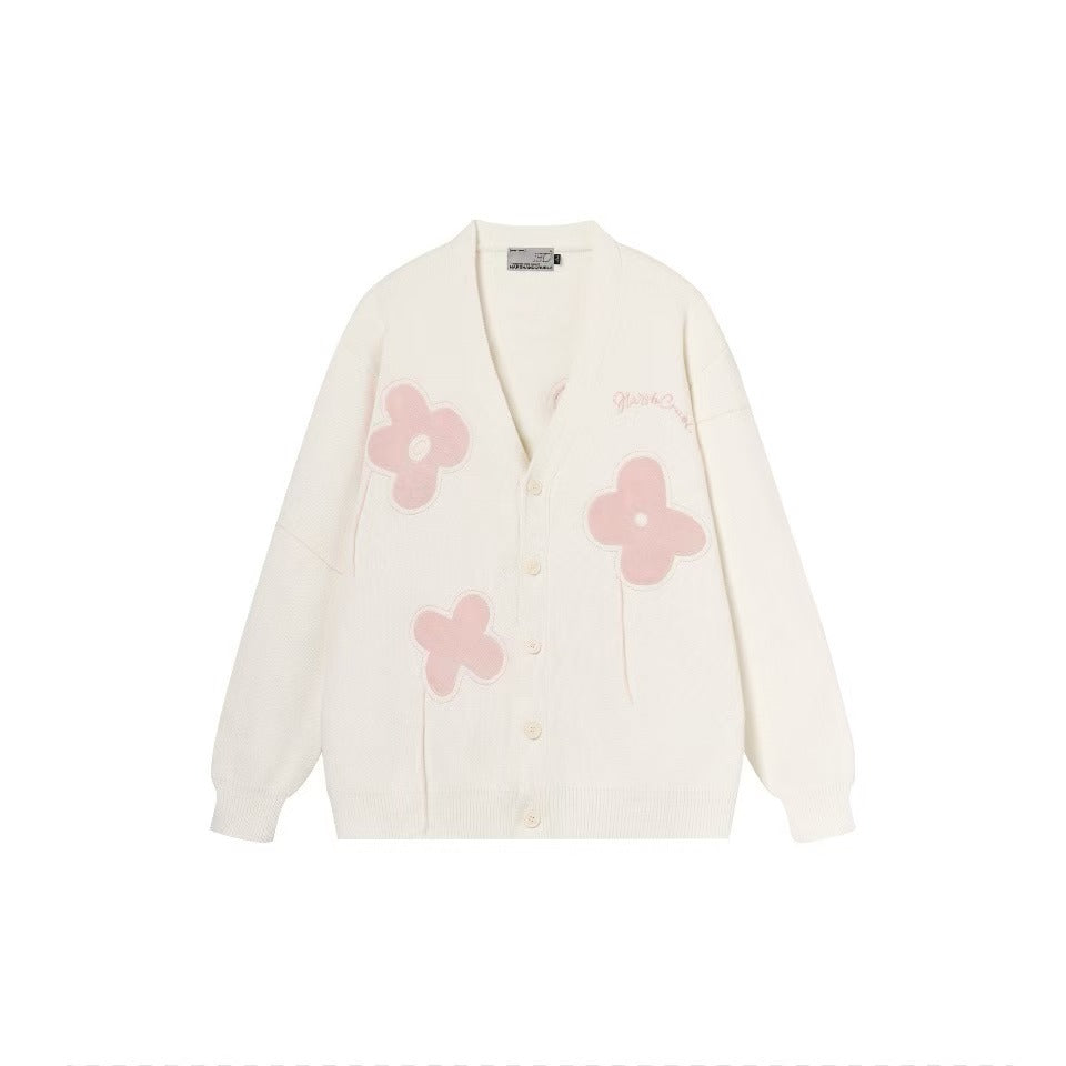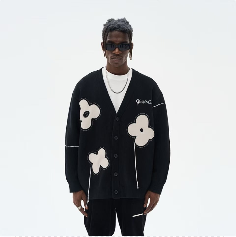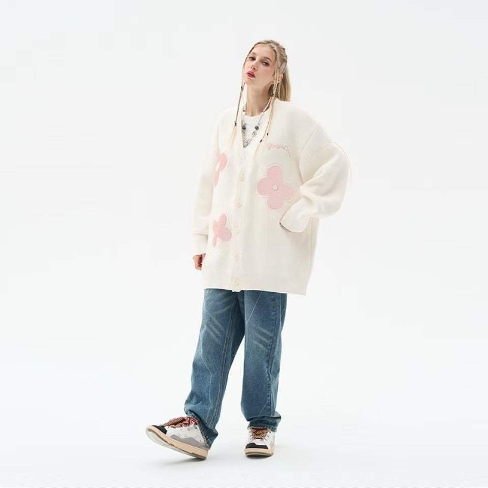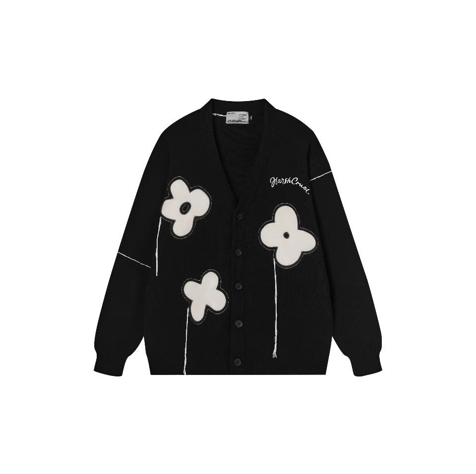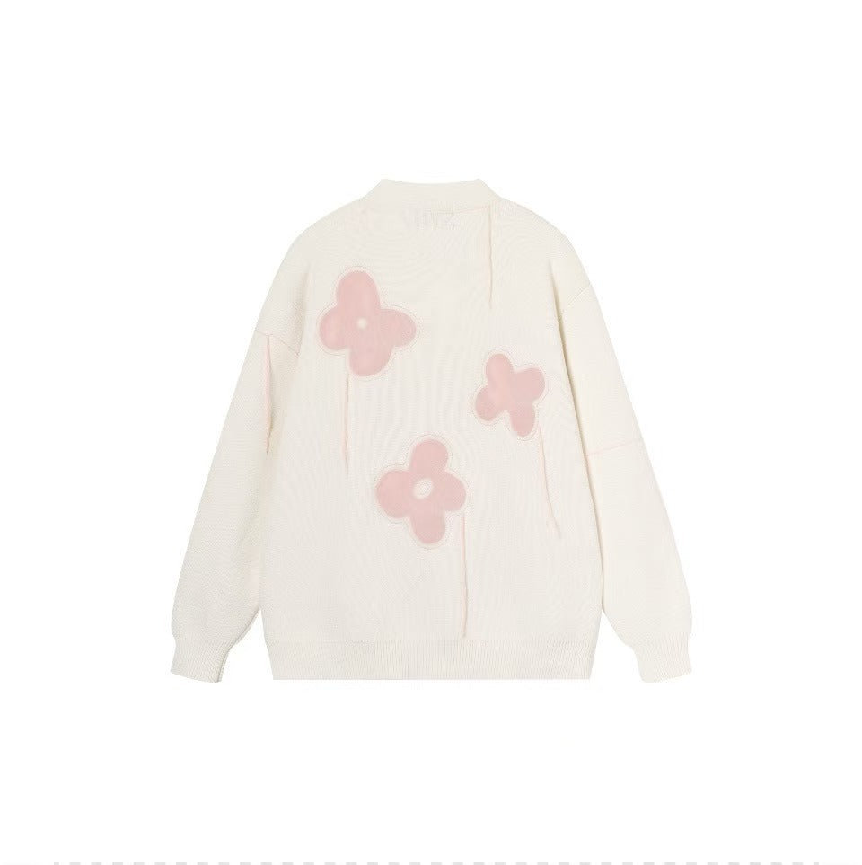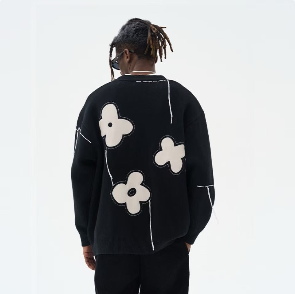 Graffiti floral jacquard hanging threads fringed raw edge casual floral loose knit sweater