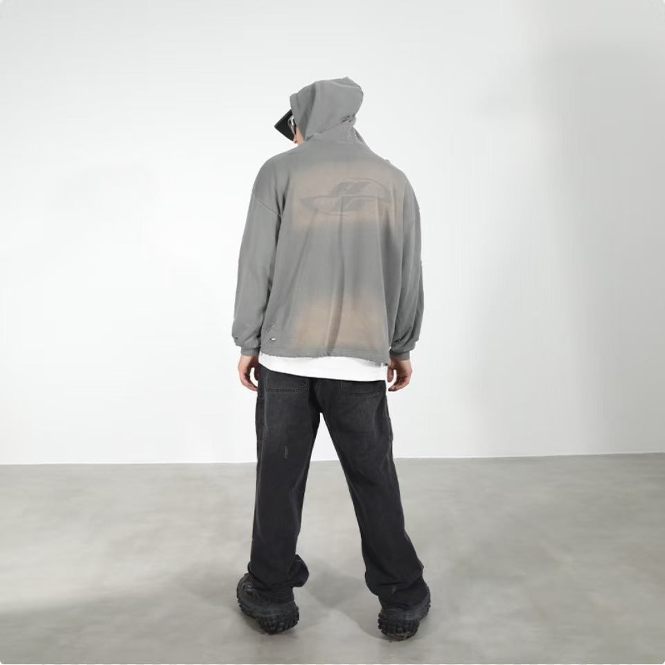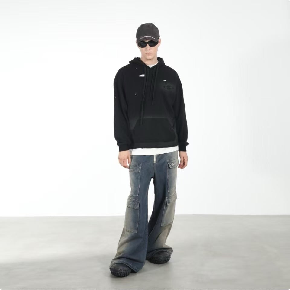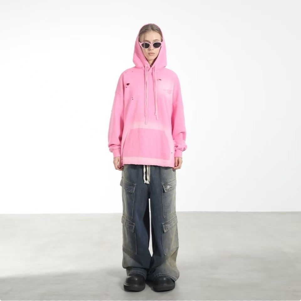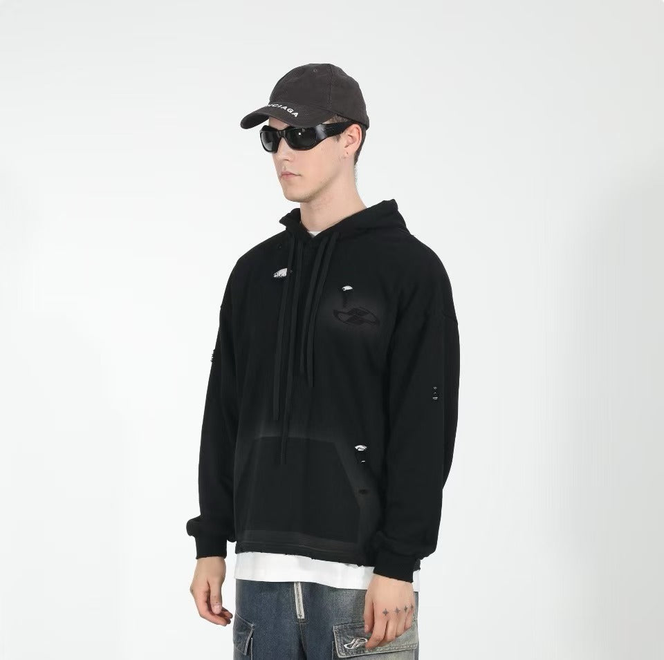 Dark Floral Wash Damage Double Hooded Rope Loose Casual Pullover Hooded Sweatshirt