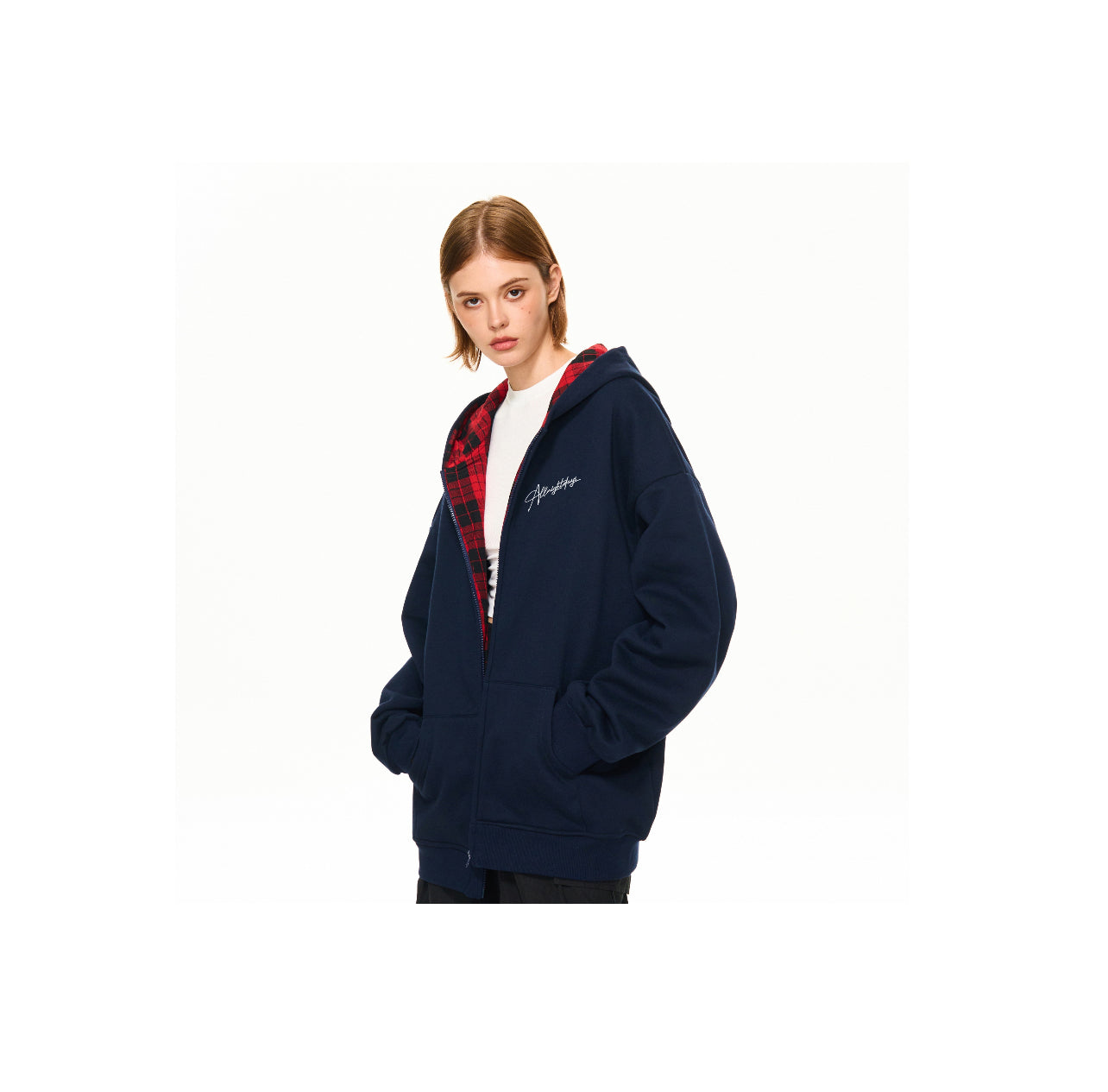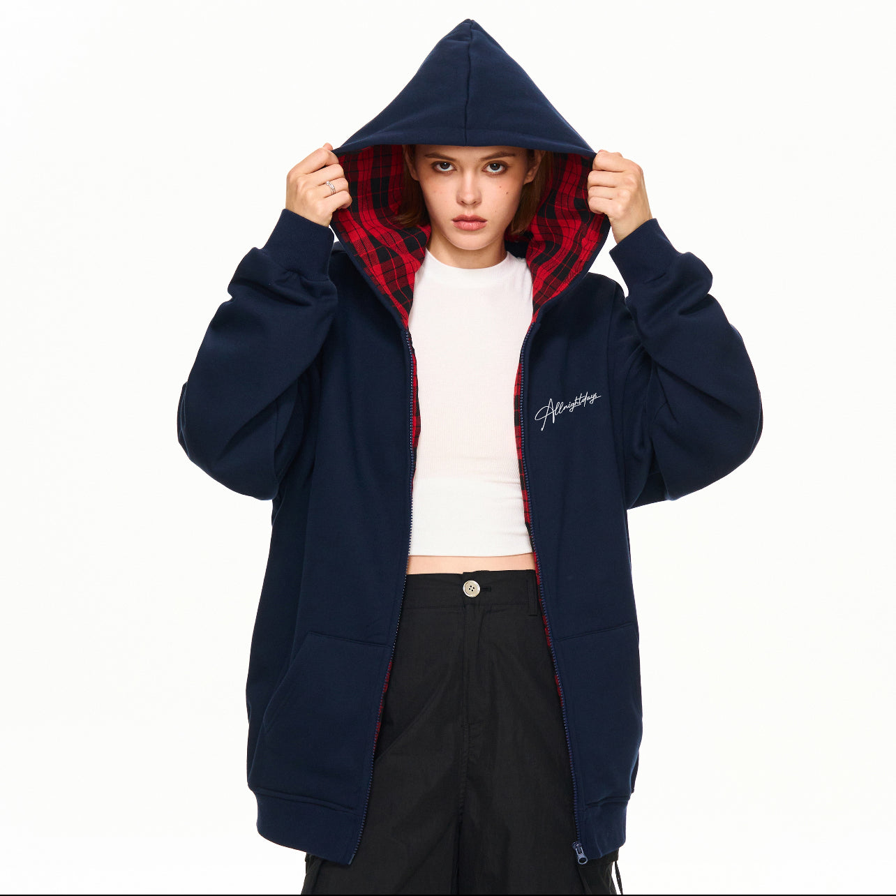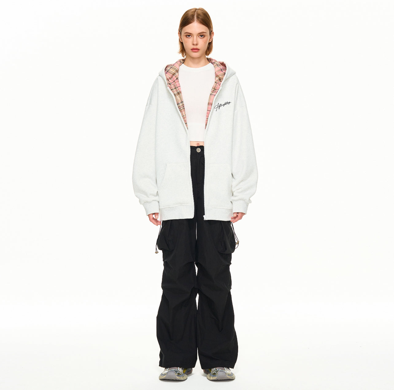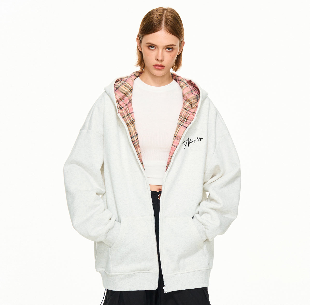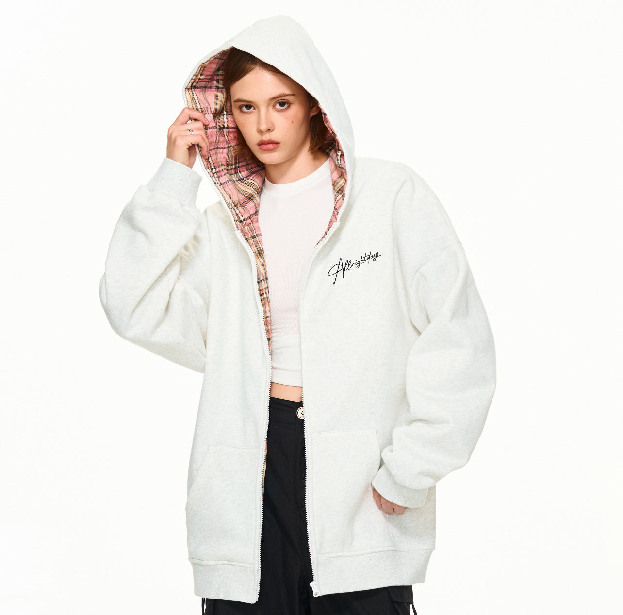 Hand-painted graffiti floral print casual simple versatile loose heavy color collision plaid patchwork hooded cardigan zipper sweater jacket