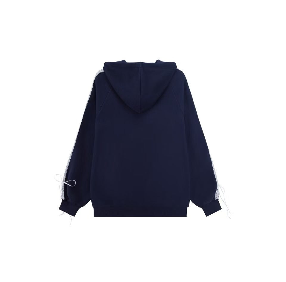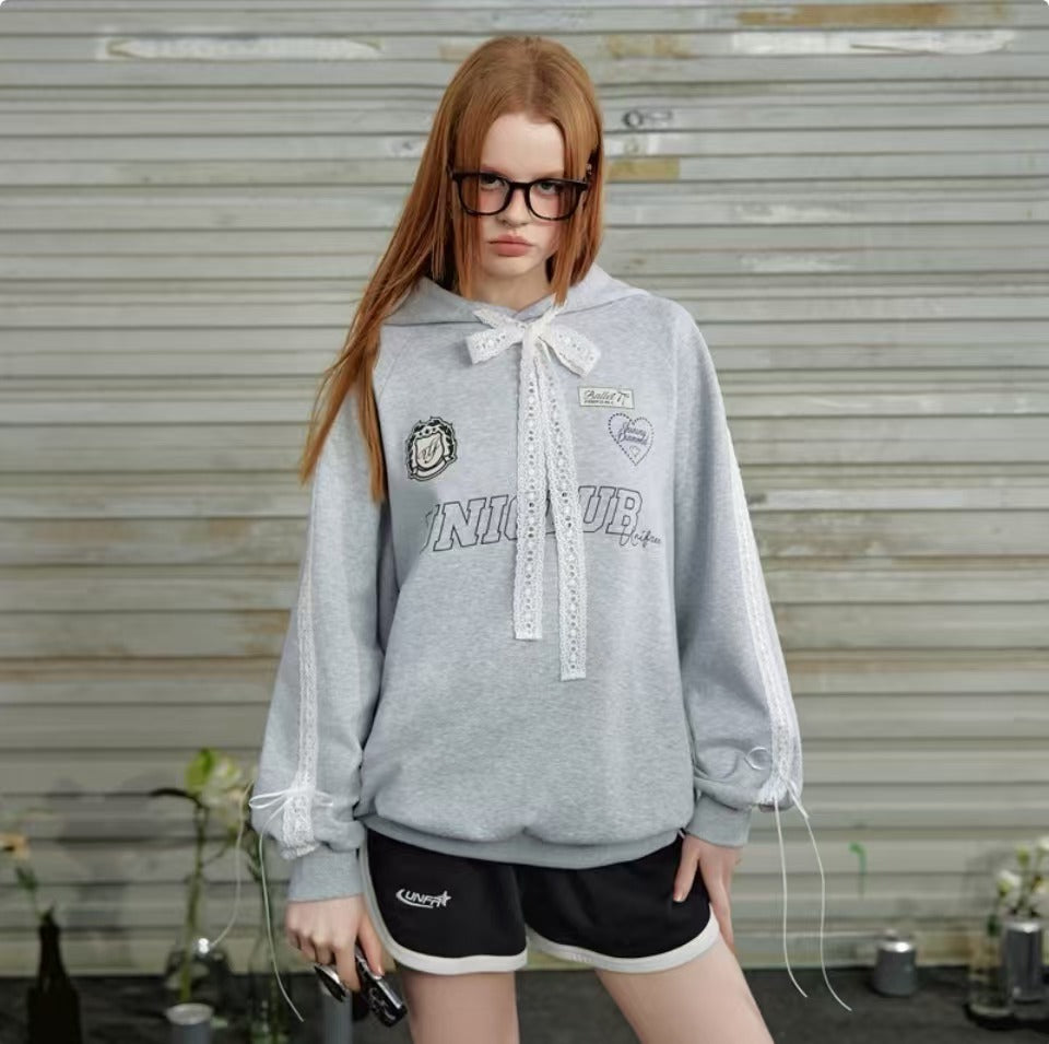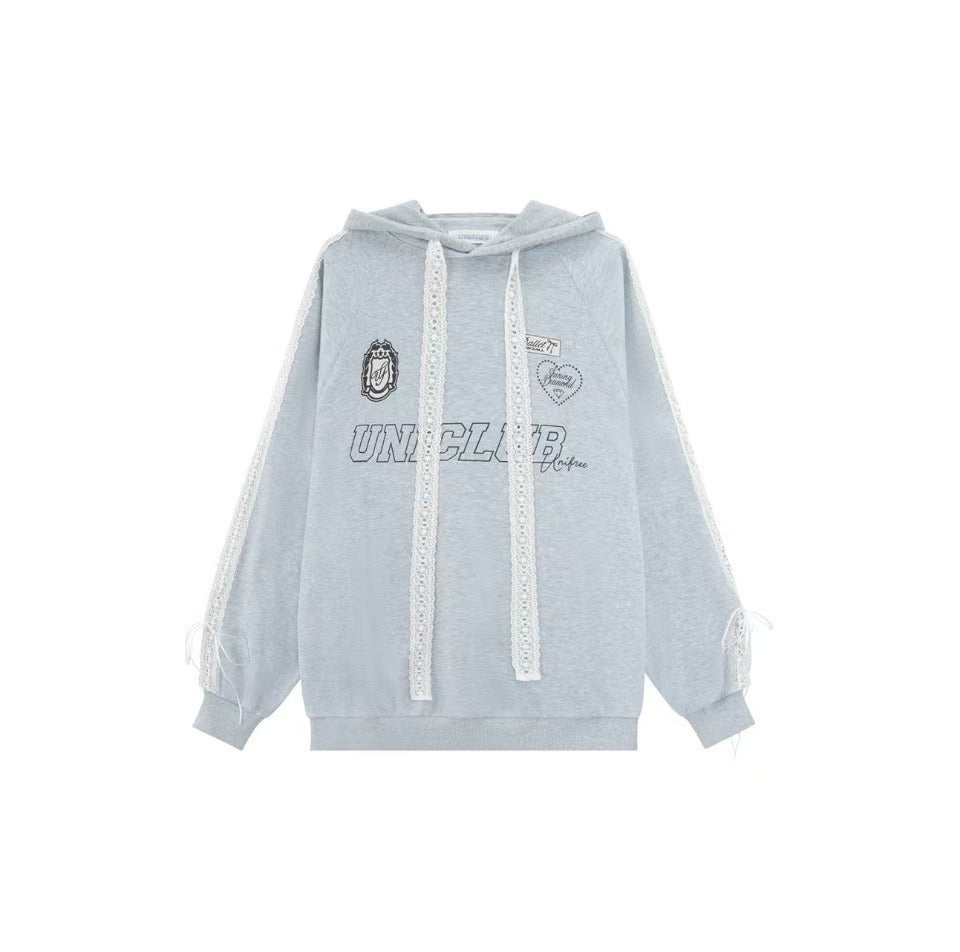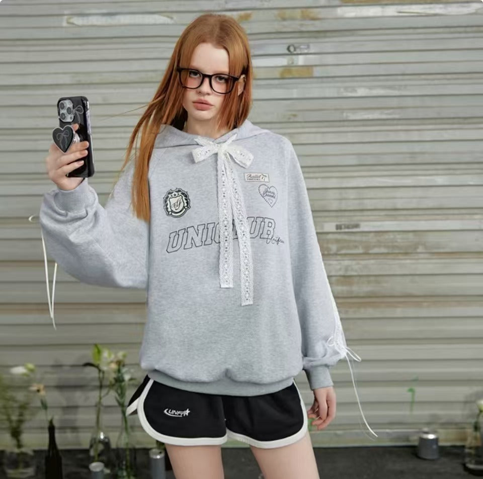 Bow tie splicing lace lace cap rope letters loose versatile casual hooded sweatshirt long-sleeved tops women's models