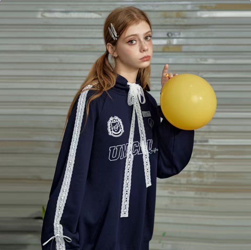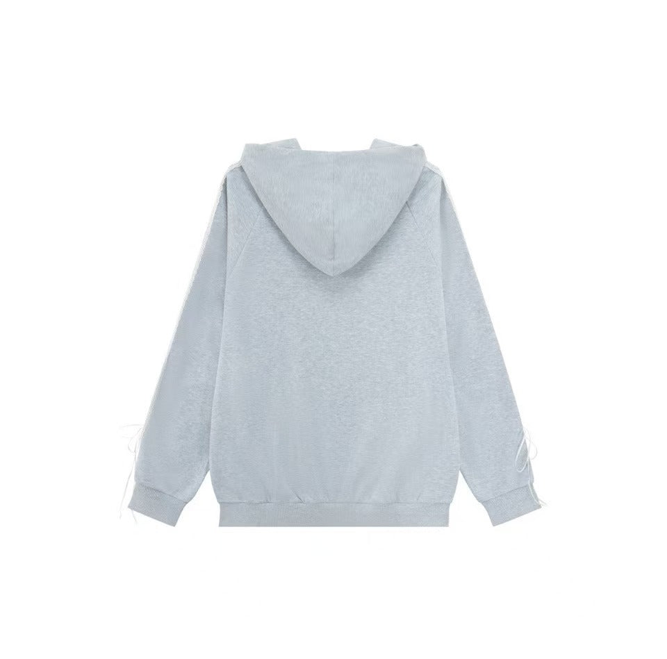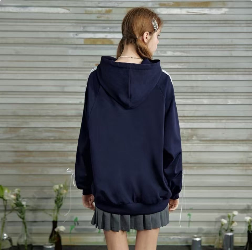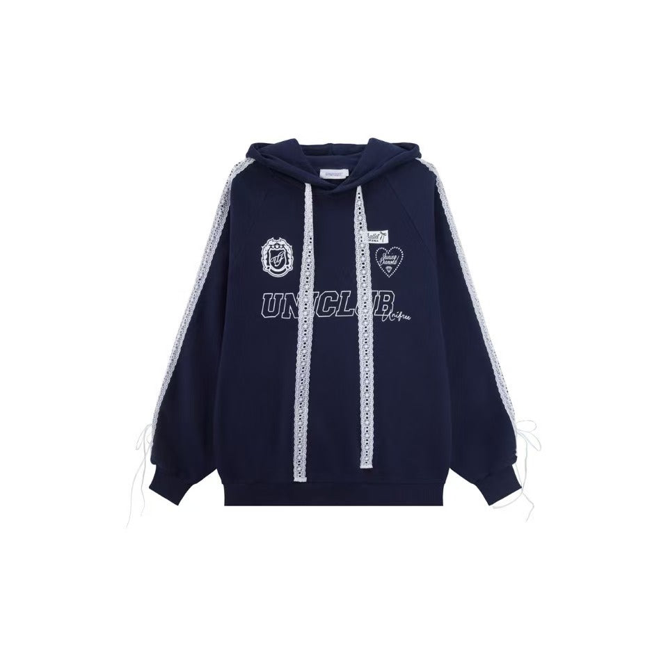 Bow tie splicing lace lace cap rope letters loose versatile casual hooded sweatshirt long-sleeved tops women's models